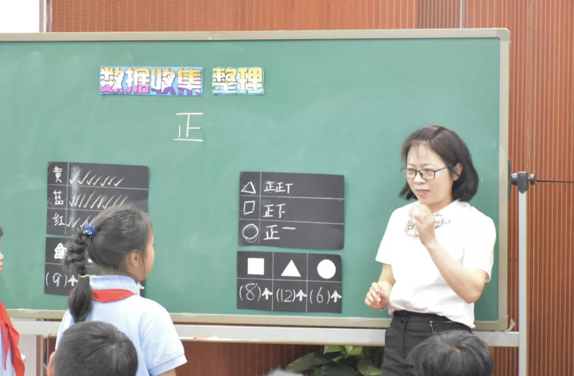 第三节课由晓庄二小的李胜利老师执教《数据收集与分类整理》。李老师创设有趣的情境,让孩子们猜猜魔盒里面有什么,充分调动学生的积极性,激起学生的探索欲望。她组织孩子进行小组合作,让他们统计魔盒里有哪些图形、汽车有哪些种类、石头剪刀布谁赢等问题,培养孩子采用不同的方法收集数据、整理数据的能力,整个数据的收集整理过程在师生互动、生生互动中充分体现出来。