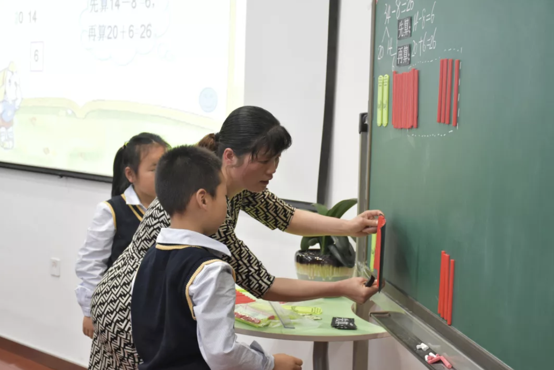 首先由晓院附小戴雪莹老师执教《口算两位数减一位数(退位)》,她由易到难,借助学具的直观操作,鼓励学生独立寻找解决问题的方法。先让学生操作小棒解决“34个位上的4减8不够减,怎么办”这个问题,学生利用小棒发现“把一捆小棒拆成10根”,从而形象地揭示“退一作十”的算理。接下来鼓励孩子说算理:34-8=?个位上的数不够减,就用十位上的一个10去减8,然后把结果与原来剩下的数相加。还可以把8分两次去减,先减去4,得到整十数,然后再减4。随后的练习巩固环节,戴老师多次运用到了“比较”的策略引导学生发现计算中的规律,有效地提升了学生数学思维能力。
