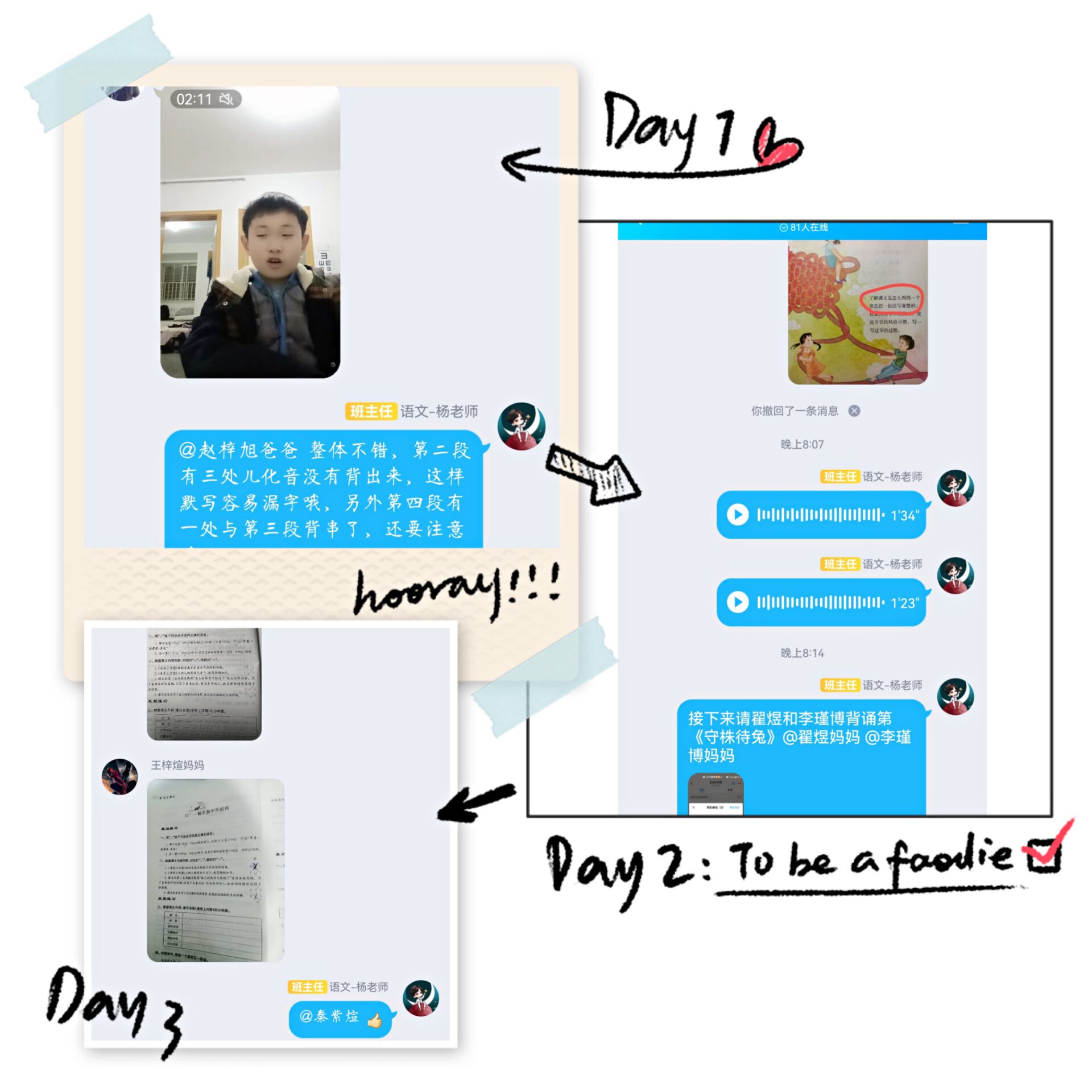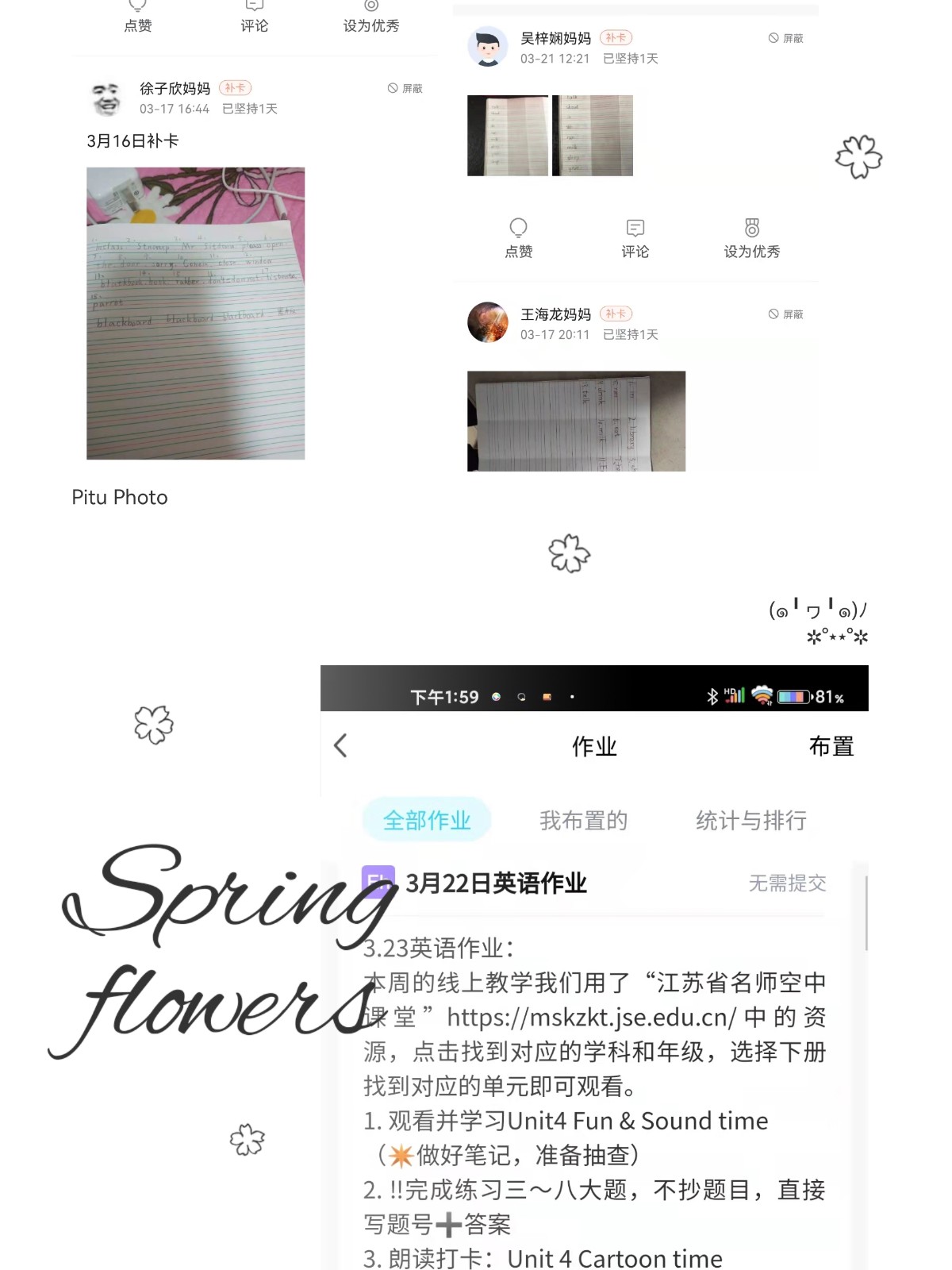 语文学科严格控制作业的总时、总量,每天在答疑时间讲评之前的作业,巩固当天的所学知识。在线上学习中重视基础知识的掌握,对作业评改认真,对学生进行了个性化鼓励性的点评。教师还采用班级优化大师随机抽选的功能,随机抽选学生,检查他们的课文朗读或背诵情况,并进行点评指导。