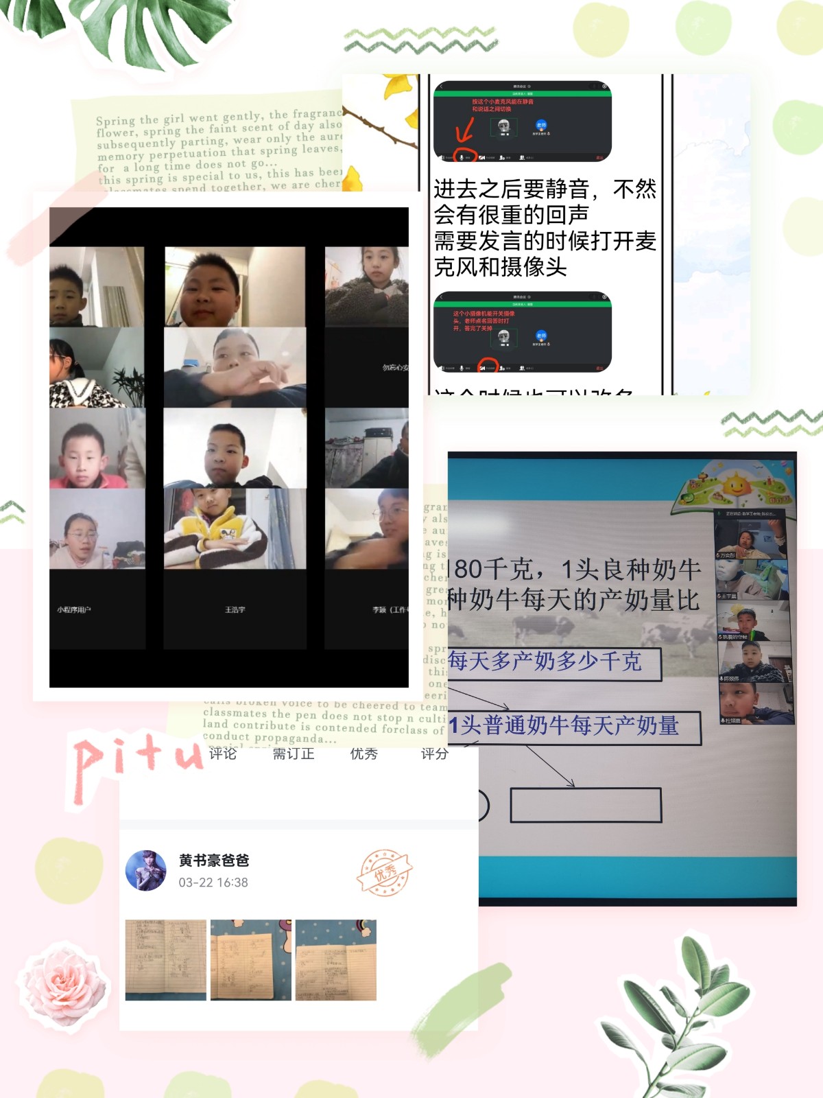 数学学科的老师们循序渐进,继续沿用学生在校作业形式,每天根据线上教学进度,为孩子布置一些作业,让孩子写在数学本上,尽量减少家长和孩子的负担、焦虑。采用晓黑板的方式批改学生作业,对优秀作业进行表扬,对问题比较大的学生进行单独辅导。晚上,通过腾讯会议、QQ群等方式,为孩子进行答疑互动,讲解作业中普遍出现的错误,对视频课中出现的较难理解的内容也进行了再次讲解。